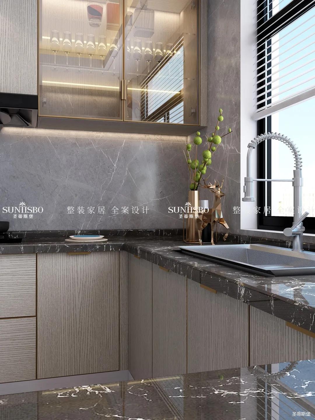 设计师以厨房&西厨区为布局的中轴,打开左右空间,延伸出厨房动线功能区,增加西厨区域,有效延伸空间。设计师打造了下午茶专属的中岛台,中岛台与客厅串连,方便屋主随时分享美食乐趣。